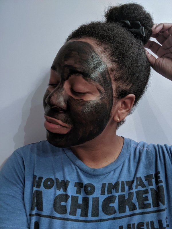 The mask is black and has a very mild grit to the creamy texture, due to the charcoal. You don’t need to apply much, just make sure you’re getting an even layer on the skin. There is definitely an acid and charcoal smell to this mask, but it is not overbearing. You are only supposed to let it sit for 10 minutes, and then wash it off.